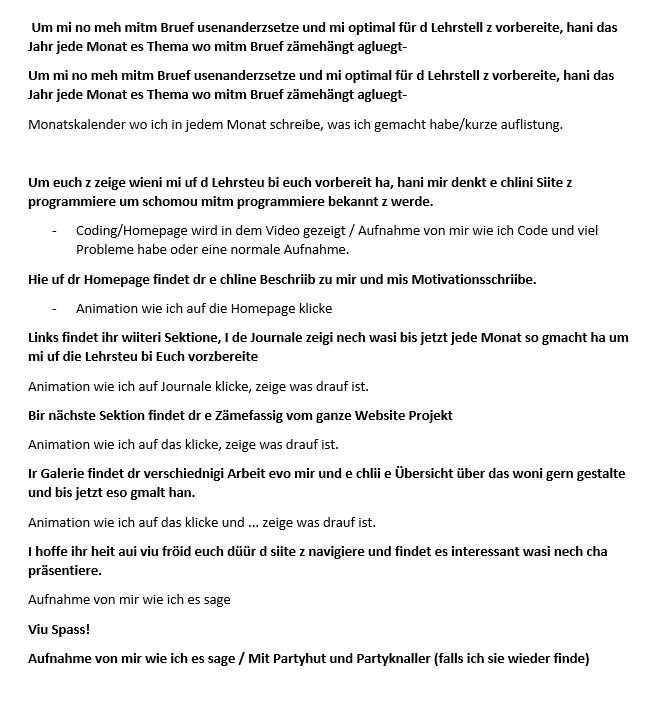 Zuerst wollte ich ein Video für die Homepage erstellen, in welchem ich vor allem die Website erklären würde. Nachdem ich einige Storyboards dafür zeichnete, verwarf ich die Idee jedoch schnell wieder und entschied mich dazu, mich selber im Video vorzustellen. Das Video sollte höchstens zwei Minuten lang sein und gute Übergänge zwischen den Szenen haben.